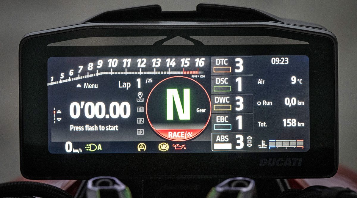 Alle Fahrmodi und deren individuelle Einstellungen lassen sich auf dem neuen, großflächigen 6,9-Zoll-TFT-Display im extrabreiten 8:3-Format hervorragend ablesen. Zwar benötigt man kurz etwas Einarbeitungszeit, um die entsprechenden Einstellmöglichkeiten zu finden und zu verstehen, doch dann lässt sich nahezu alles einfach und gut erklärt einstellen. Zwar hat man auf der Rennstrecke oft recht wenig Zeit, um auf das Display zu achten, doch in den Momenten, in denen ich drauf schaute, war alles immer hervorragend ablesbar – selbst bei direkter Sonneneinstrahlung. Hier hilft sicher, dass das Display technisch stark an ein High-End-Smartphone-Display angelehnt wurde, bei dem Ablesbarkeit und Klarheit immer gegeben sind.