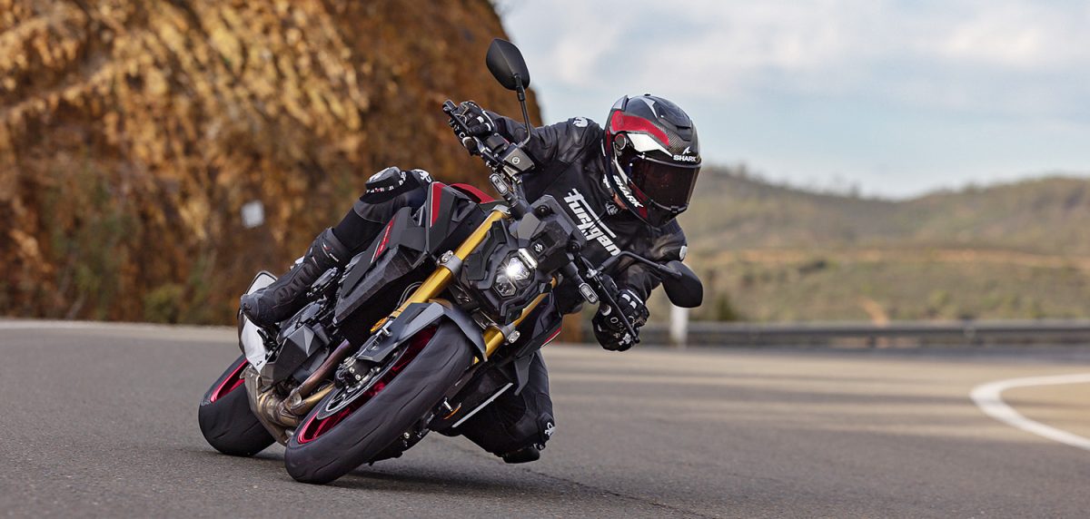 Für die perfekte Linie sorgt ein Aluminium-Brückenrahmen mit einer von der GSX-R abgeleiteten Schwinge, KYB-USD-Gabel und einem voll einstellbaren Zentralfederbein. Dazu kommen Brembo-Monoblocks mit 310-mm-Doppelscheiben, die jederzeit bissig, aber kontrolliert zupacken. Ergonomie, Lenkerbreite und Gewichtsverteilung sind auf aktive Kontrolle und hohen Fahrkomfort abgestimmt.